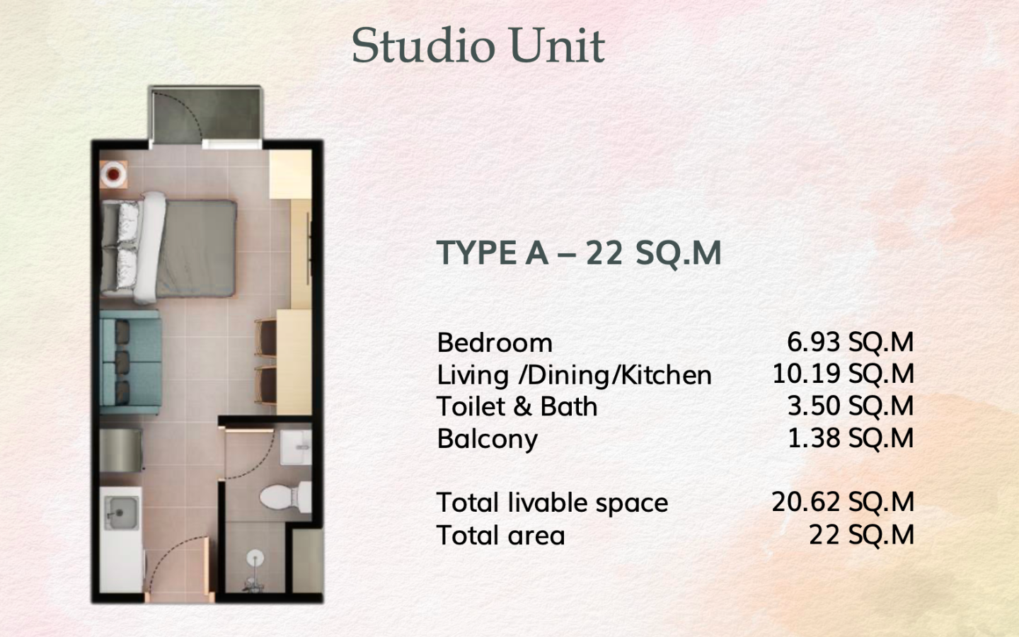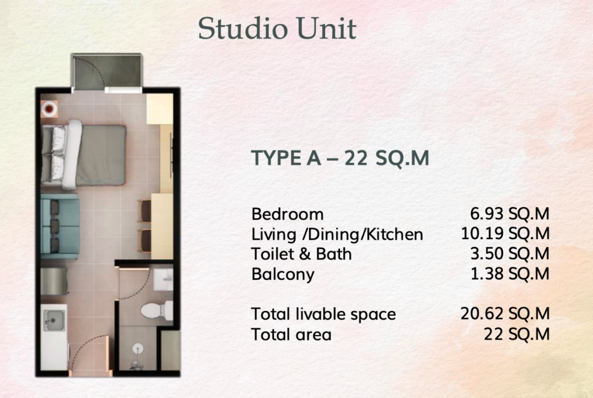 • Studio unit – 22.01 sqm floor area